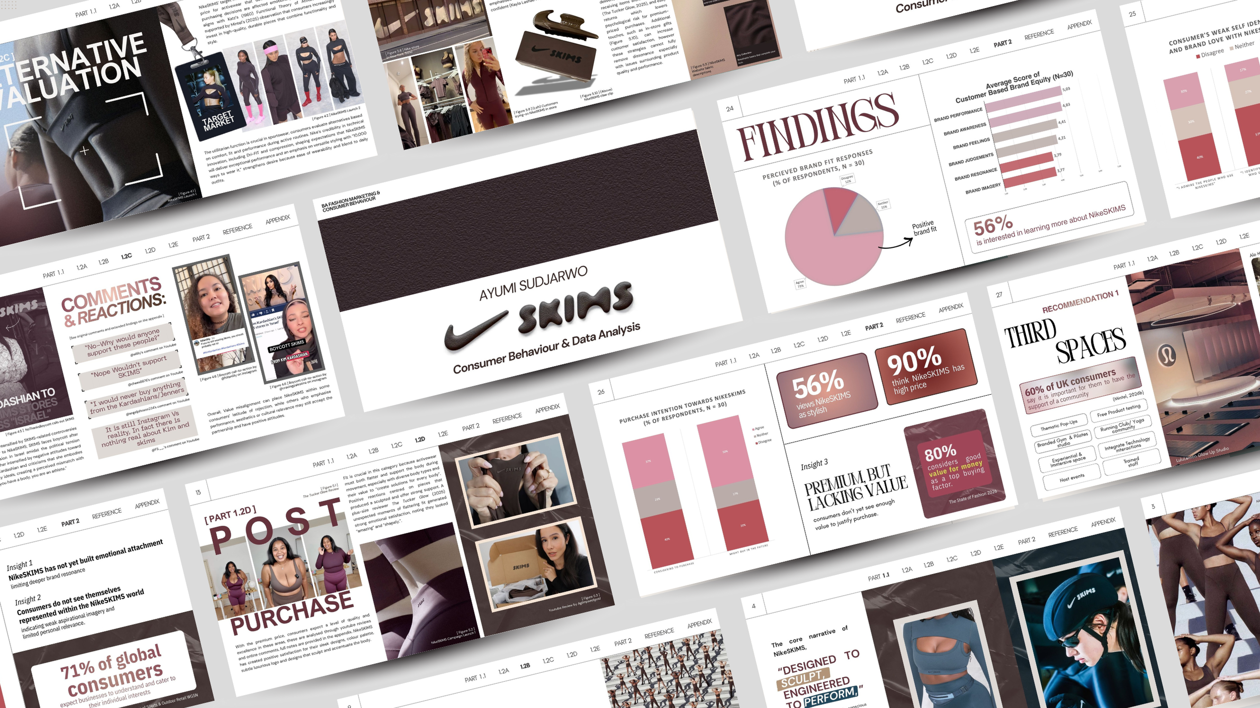 A consumer insight and strategy project analysing how Nike and SKIMS’ co-branding translates into customer-based brand equity among Gen Z women. Using primary survey data and secondary research, I identified key gaps in emotional connection, aspiration, and perceived value, and developed experience-led, partnership-driven, and product innovation recommendations.